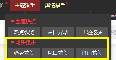 主题猎手的龙头狙击现在变成了三个细分功能,“风口龙头”就是之前的龙头狙击功能,趋势龙头跟价值龙头就是新增加的