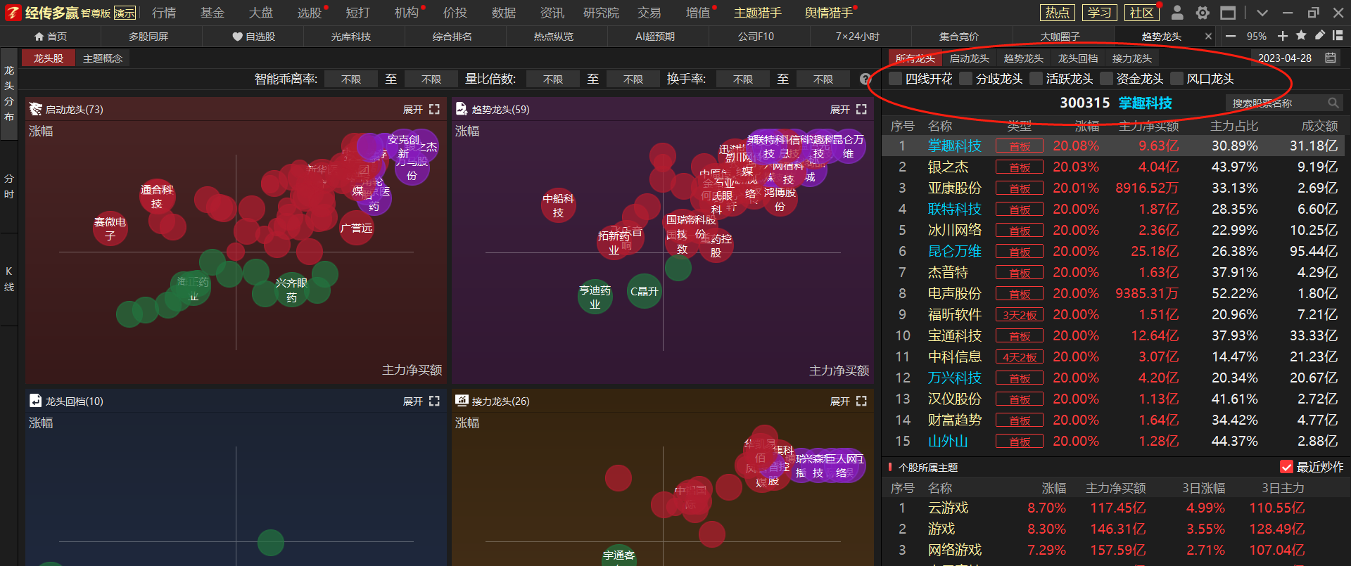 3、选股方法:【多重龙头+四线开花+主力动向紫】①打开【主题猎手】--选择【龙头狙击】进入主页面